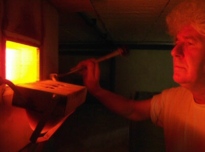 In einer Spezialform schmilzt hochtransparentes Glas bei 1000° C. Danach gezielt gekühlt wird das massive, aus einem Stück bestehende Glasobjekt robust. Jahrzehntelange Erfahrungen in der Glasgestaltung sind Voraussetzung für die Beherrschung der aufwendigen Glastechnik. |